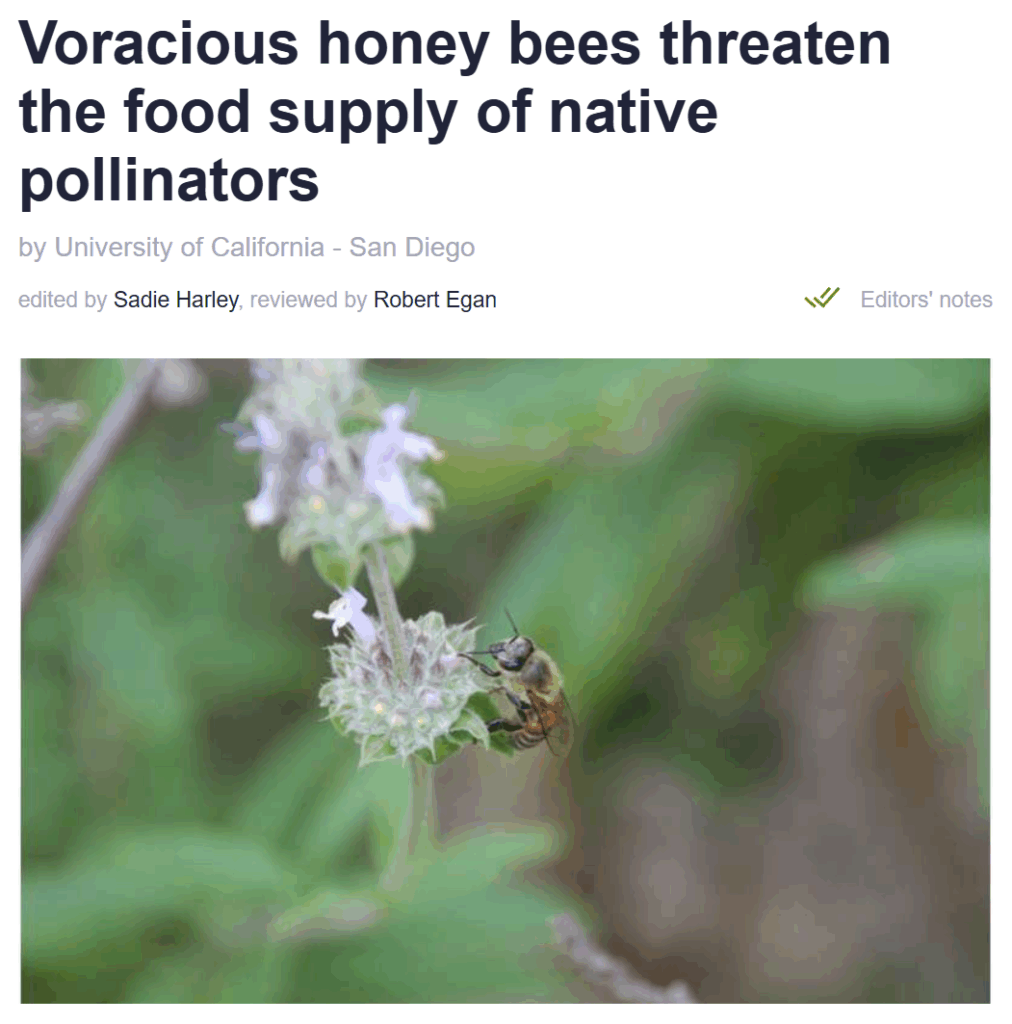 “Glubske honningbier truer hjemmehørende bestøveres fødeforsyning,” viser et studie fra University of California, som du kan læse om på det videnskabelige forum: Phys.org.