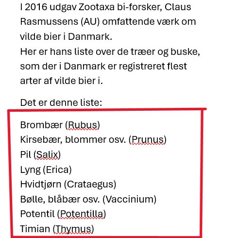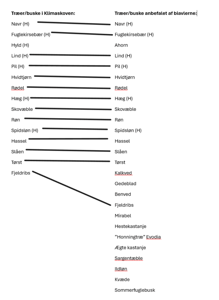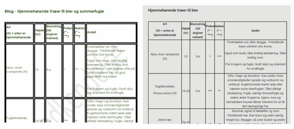 Her ser du til venstre anbefalingerne fra Lejre kommune – og til højre de anbefalinger, som Danmarks Biavlerforeningen har på deres hjemmeside, til, hvilke træer og buske som er gode for honningbier: